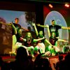 Un gruppo di persone in posa su un palco, con luci colorate e pubblico in ombra.