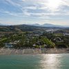 Panorama aereo di una costa con ombrelloni, resort e campagna collinare sullo sfondo.