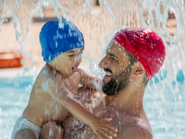Uomo con bambino sotto una fontana a cascata in una piscina.