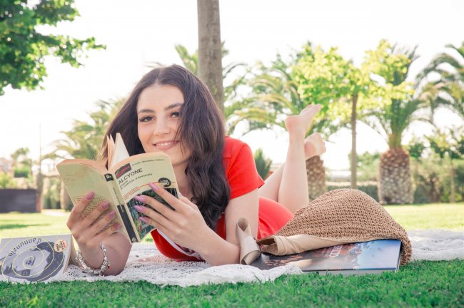 Persona distesa sull'erba che legge un libro. Sfondo con palme.