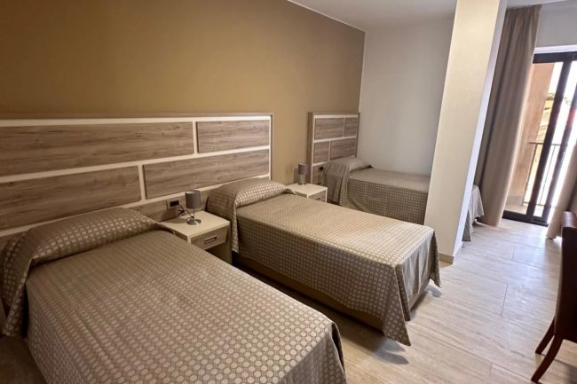Tre letti singoli in una camera con testiere in legno e parete beige.