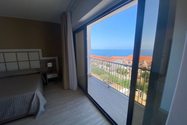 Camera d'albergo vista dal balcone, con letto matrimoniale e panorama marino.