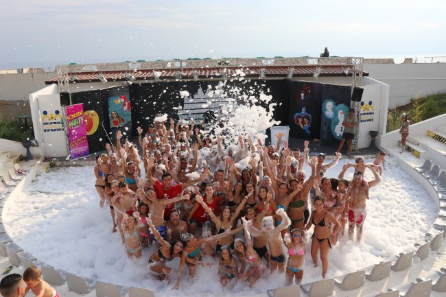 Una festa in piscina piena di schiuma con molte persone in costume.