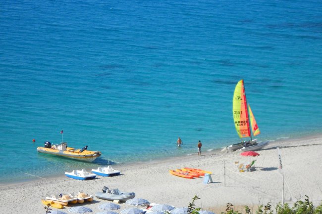 Spiaggia con sabbia bianca, barche, pedalò e una barca a vela colorata sul mare turchese.