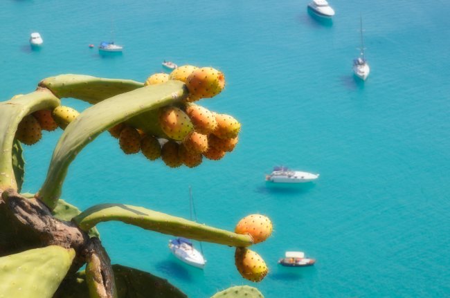 Cactus con frutti arancioni in primo piano con mare turchese e barche sullo sfondo.