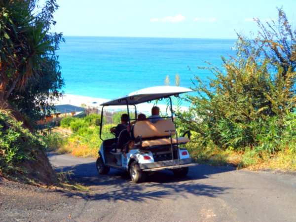 Persone in golf cart su una strada con vegetazione che conduce a una spiaggia e mare blu.