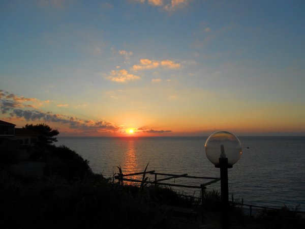Tramonto sul mare con cielo nuvoloso, lampione a globo in primo piano.
