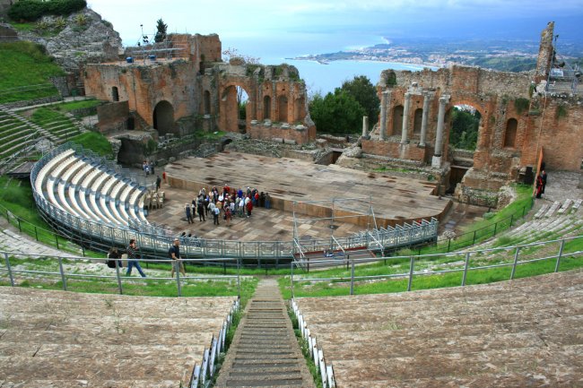 Antico teatro in pietra con gradinate semicircolari, vista mare.