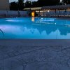 Piscina illuminata di sera con ombrelloni e lettini intorno.