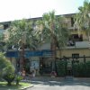 Edificio con palme e un'insegna blu. Persone sedute all'esterno. Cielo sereno.