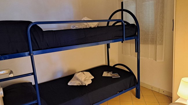 Camera con letto a castello e matrimoniale, bagno annesso.