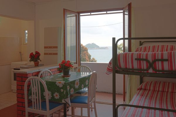 Interno con tavolo e letti a castello, vista mare dalla finestra aperta.