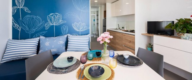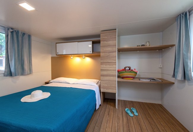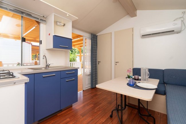 soluzione spaziosa e confortevole e dotata di tutti i comfort. Alloggio di 32 mq + ampia veranda con tavolo e sedie, aria condizionata, camera matrimoniale, cameretta con due letti singoli e letto a bandiera, soggiorno pranzo con tavolo e divano, angolo cottura completamente accessoriato, ampio bagno con wc e doccia, oppure con bidet e box doccia. Alcune soluzioni omologate per disabili