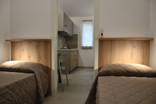 Camera con letti singoli e piccola cucina.