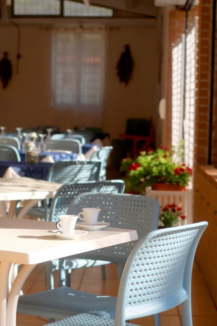 Dettaglio di un tavolo con tazzine e sedie azzurre.