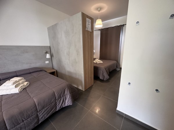 CAMERA FAMILIARE DA 4 A 6 PERSONE: letto matrimoniale e 4 letti singoli, bagno con box doccia, asciugacapelli, cassetta di sicurezza. Camere vista mare o vista giardino con veranda privata.