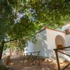 Una piccola casa bianca circondata da alberi, con tavolo e sedie nel patio.