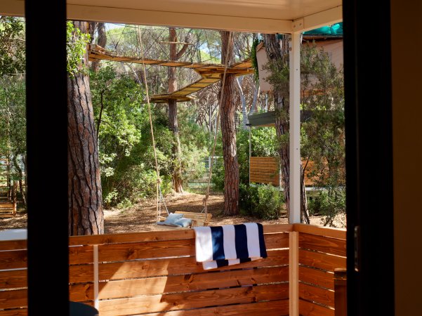 Bungalow in legno tra gli alberi con un’altalena e una tenda sospesa.