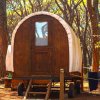 Piccole cabine in legno e una tenda, immerse in una pineta.
