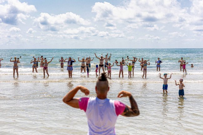 Persone fanno esercizi in mare sotto il sole.